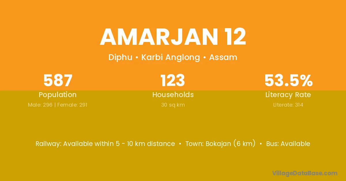 Bokajan (6 km) is the nearest town to Amarjan 12 village for major economic activities and is located approximately 6 km away.