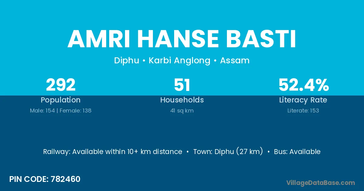 Diphu (27 km) is the nearest town to Amri Hanse Basti village for major economic activities and is located approximately 27 km away.