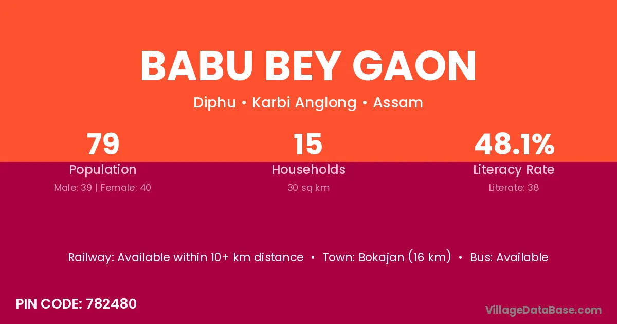 Bokajan (16 km) is the nearest town to Babu Bey Gaon village for major economic activities and is located approximately 16 km away.