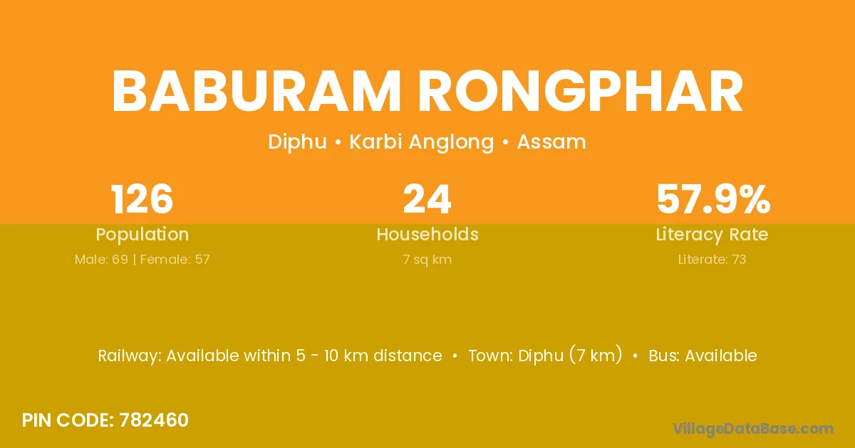 Diphu (7 km) is the nearest town to Baburam Rongphar village for major economic activities and is located approximately 7 km away.