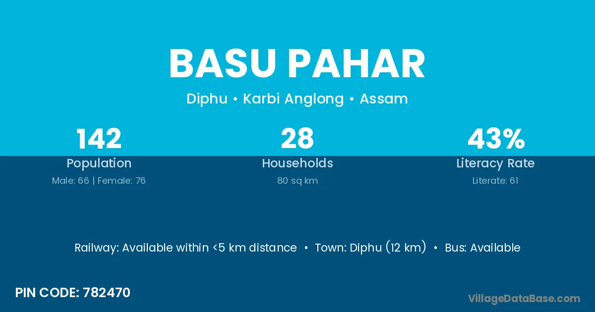 Diphu (12 km) is the nearest town to Basu Pahar village for major economic activities and is located approximately 12 km away.