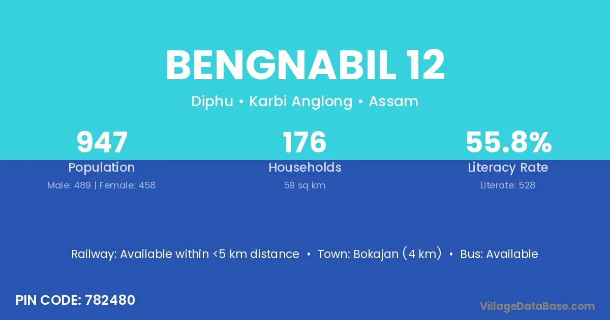 Bokajan (4 km) is the nearest town to Bengnabil 12 village for major economic activities and is located approximately 4 km away.