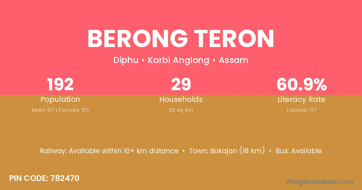 Bokajan (18 km) is the nearest town to Berong Teron village for major economic activities and is located approximately 18 km away.