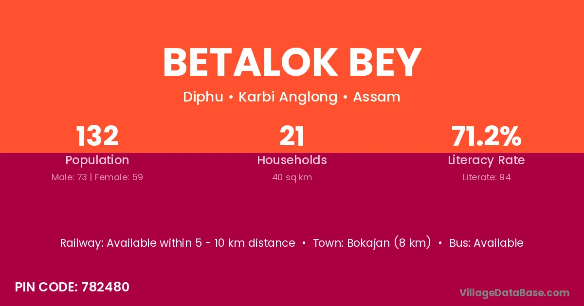 Bokajan (8 km) is the nearest town to Betalok Bey village for major economic activities and is located approximately 8 km away.