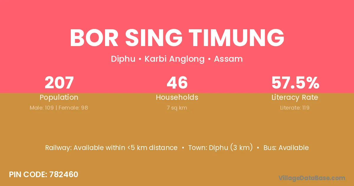 Diphu (3 km) is the nearest town to Bor Sing Timung village for major economic activities and is located approximately 3 km away.
