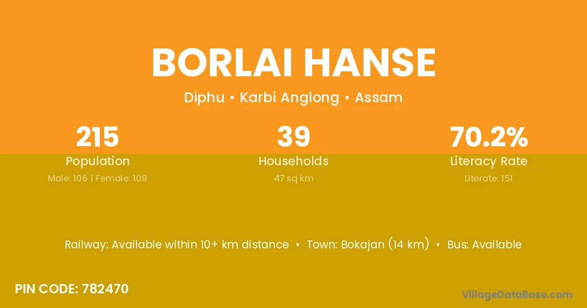 Bokajan (14 km) is the nearest town to Borlai Hanse village for major economic activities and is located approximately 14 km away.