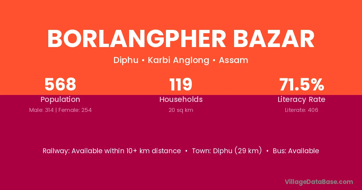 Diphu (29 km) is the nearest town to Borlangpher Bazar village for major economic activities and is located approximately 29 km away.