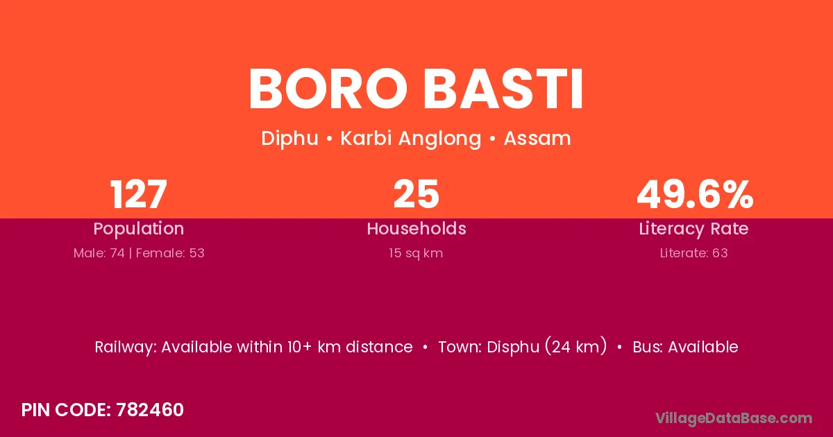 Disphu (24 km) is the nearest town to Boro Basti village for major economic activities and is located approximately 24 km away.