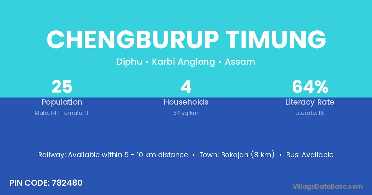 Bokajan (8 km) is the nearest town to Chengburup Timung village for major economic activities and is located approximately 8 km away.