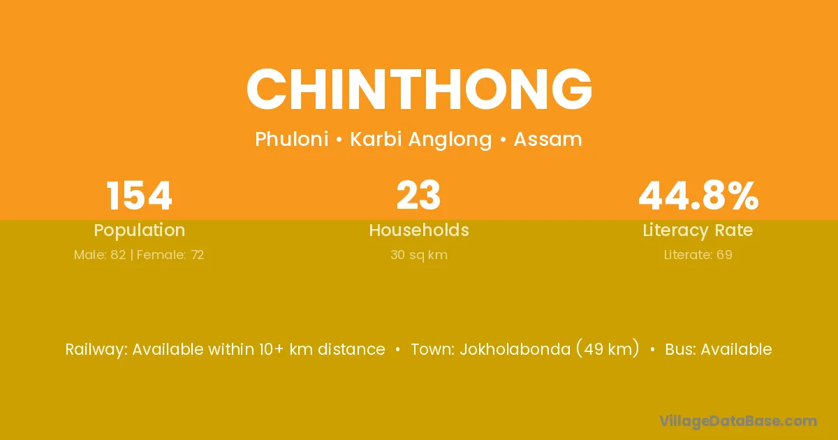 Bokajan (12 km) is the nearest town to Chinthong village for major economic activities and is located approximately 12 km away.