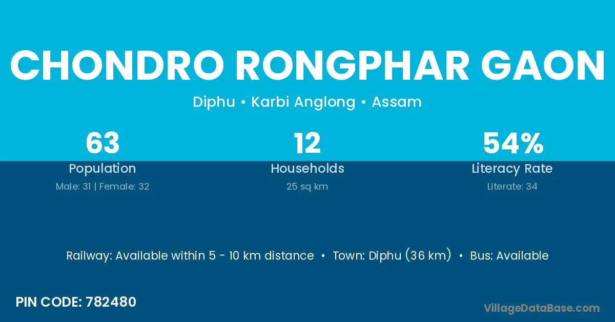 Diphu (36 km) is the nearest town to Chondro Rongphar Gaon village for major economic activities and is located approximately 36 km away.