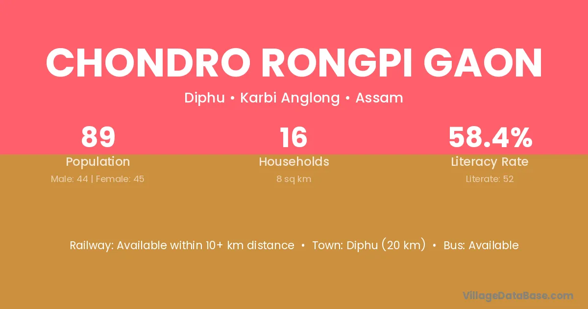 Chondro Rongpi Gaon village has a total population of 89 people, of which 44 are males and 45 are females.