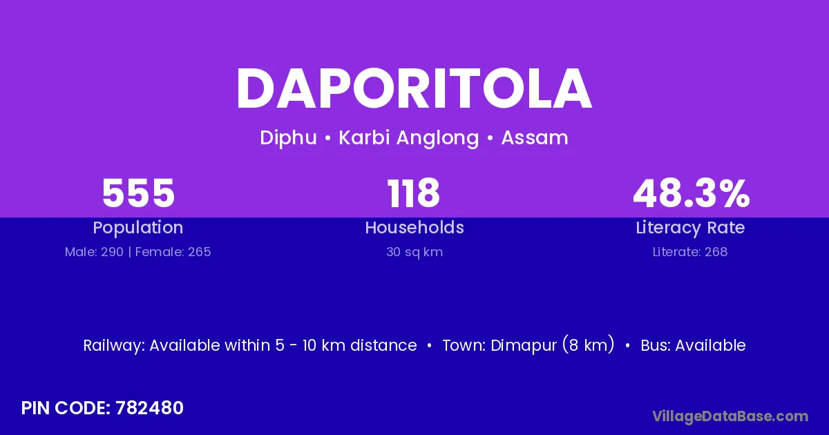 Dimapur (8 km) is the nearest town to Daporitola village for major economic activities and is located approximately 8 km away.