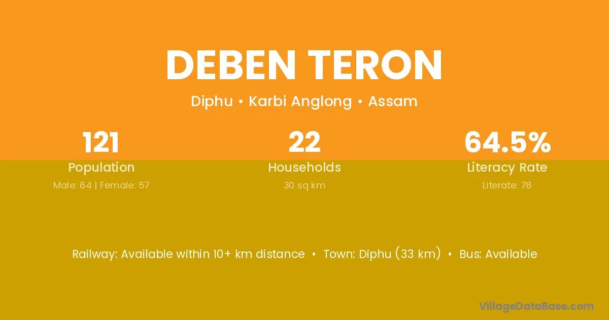 Diphu (33 km) is the nearest town to Deben Teron village for major economic activities and is located approximately 33 km away.