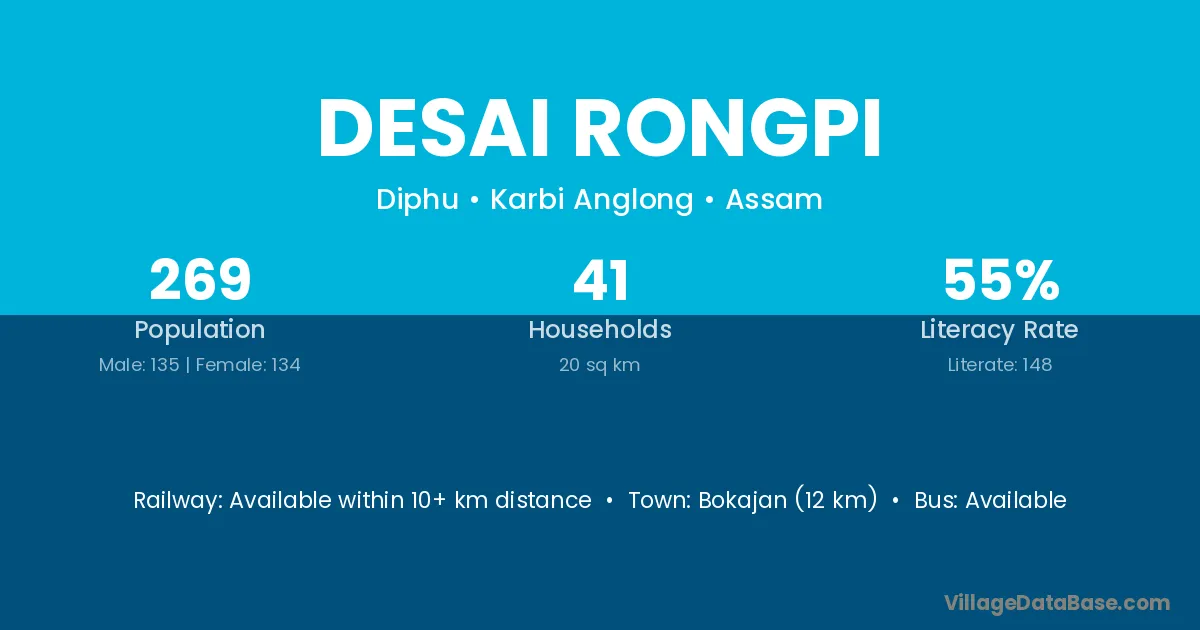 Bokajan (12 km) is the nearest town to Desai Rongpi village for major economic activities and is located approximately 12 km away.