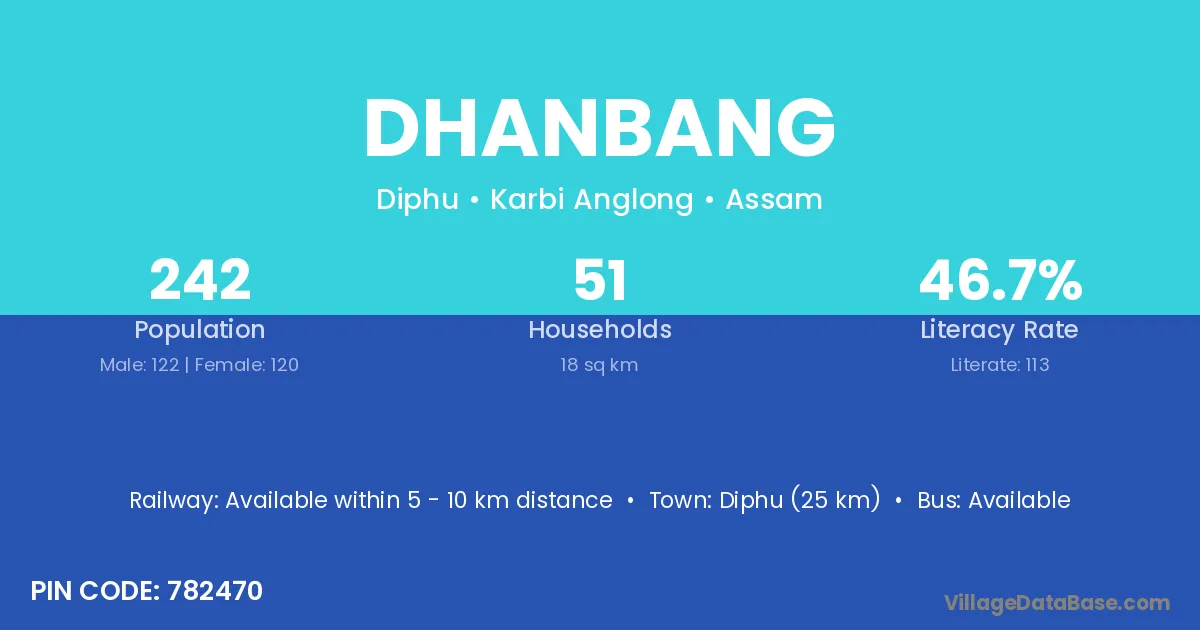 Dhanbang village has a total population of 242 people, of which 122 are males and 120 are females.