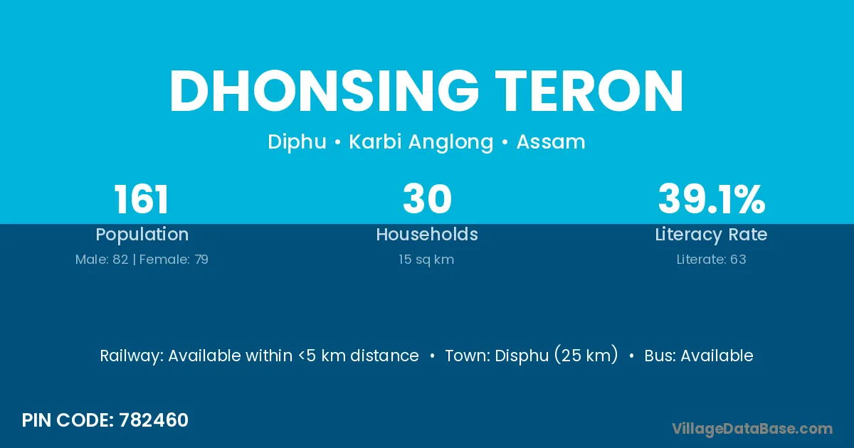 Disphu (25 km) is the nearest town to Dhonsing Teron village for major economic activities and is located approximately 25 km away.