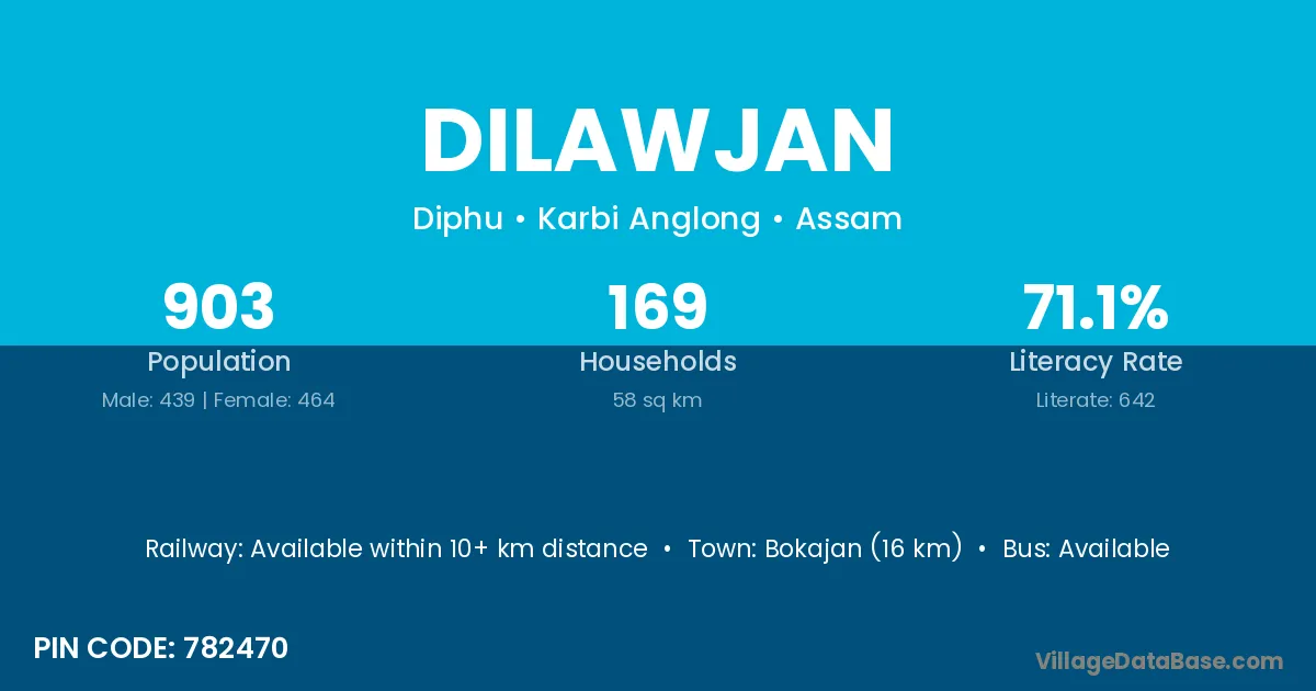 Bokajan (16 km) is the nearest town to Dilawjan village for major economic activities and is located approximately 16 km away.