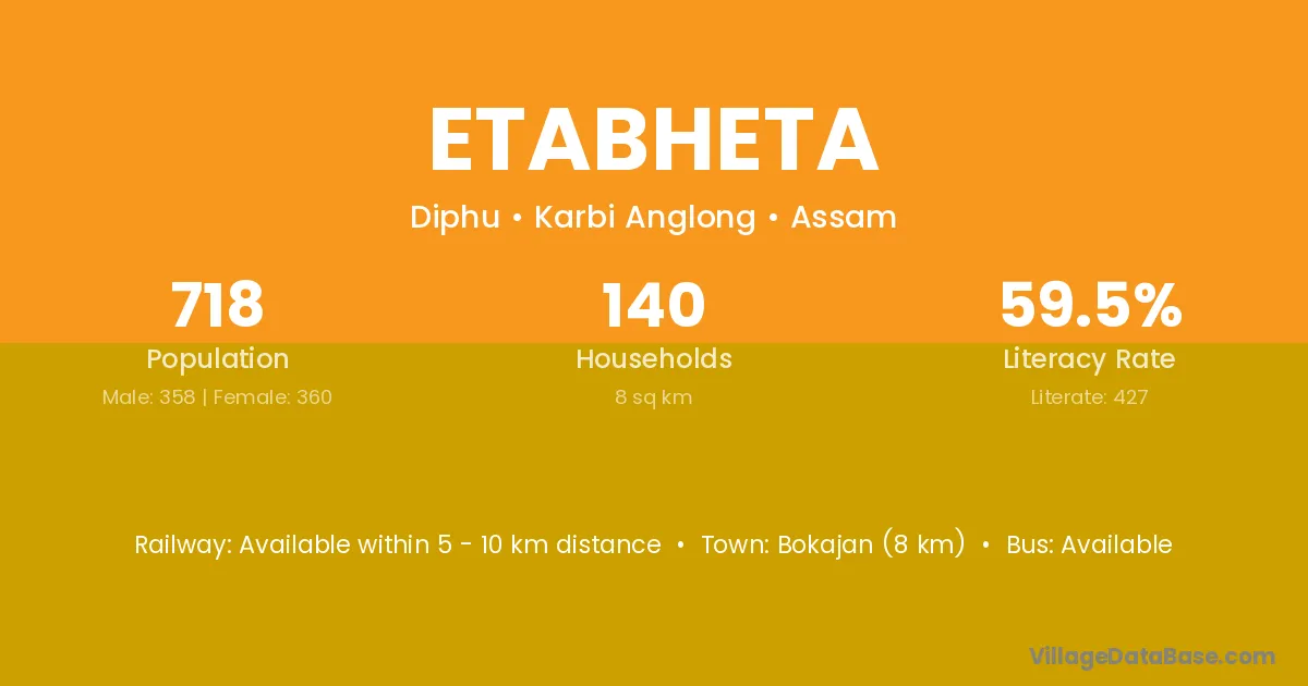 Bokajan (8 km) is the nearest town to Etabheta village for major economic activities and is located approximately 8 km away.