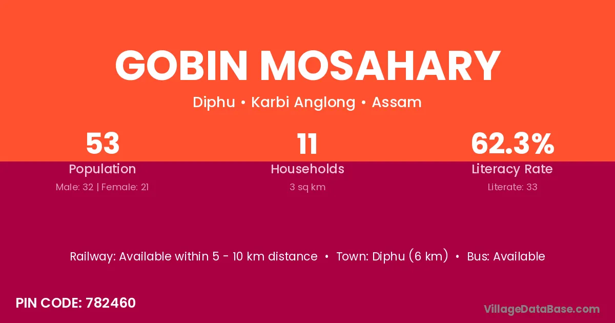 Diphu (6 km) is the nearest town to Gobin Mosahary village for major economic activities and is located approximately 6 km away.