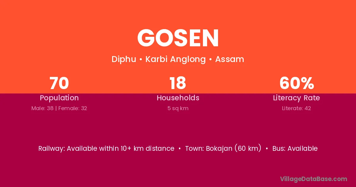 Bokajan (60 km) is the nearest town to Gosen village for major economic activities and is located approximately 60 km away.