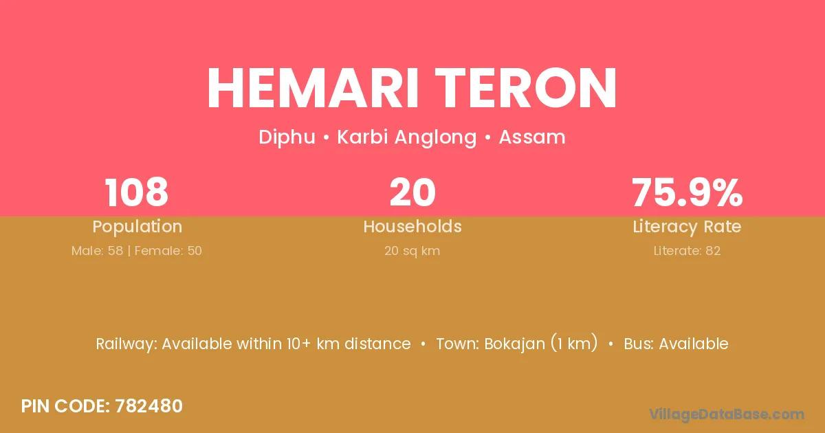 Bokajan (1 km) is the nearest town to Hemari Teron village for major economic activities and is located approximately 1 km away.