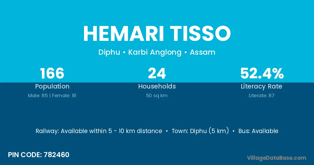 Diphu (5 km) is the nearest town to Hemari Tisso village for major economic activities and is located approximately 5 km away.