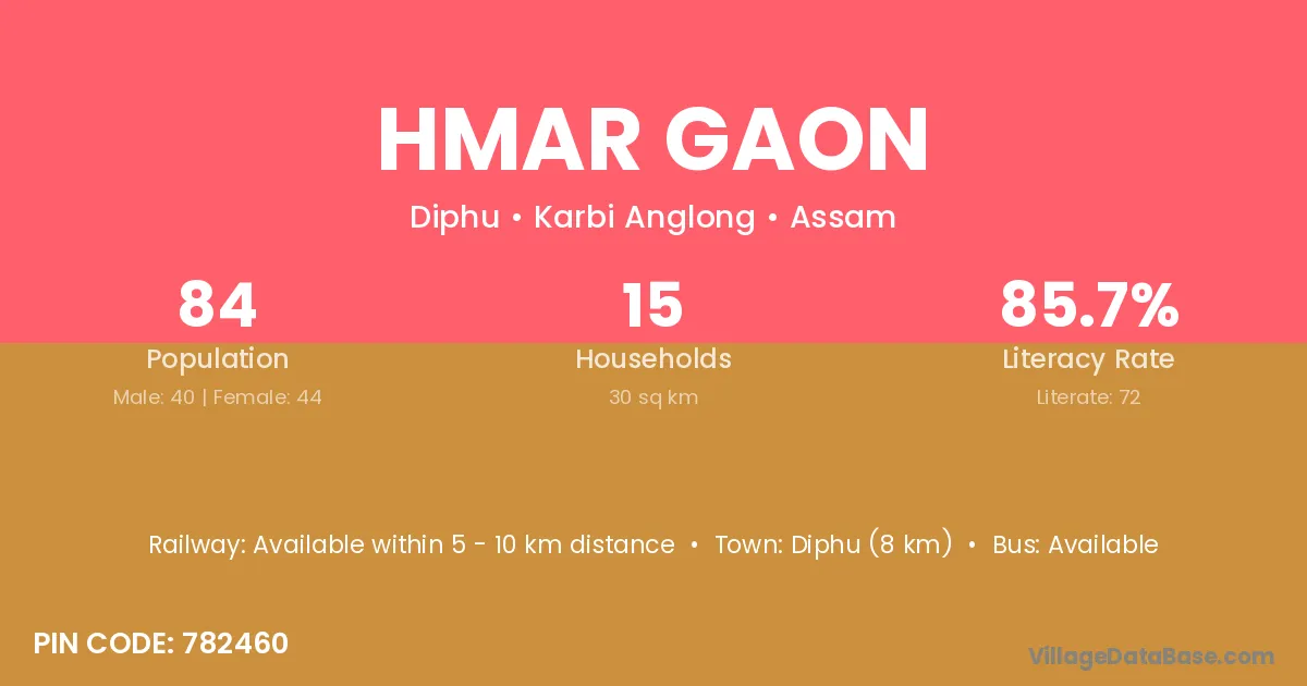 Diphu (8 km) is the nearest town to Hmar Gaon village for major economic activities and is located approximately 8 km away.