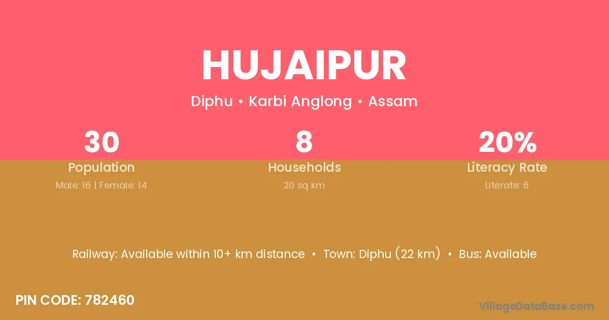 Diphu (22 km) is the nearest town to Hujaipur village for major economic activities and is located approximately 22 km away.