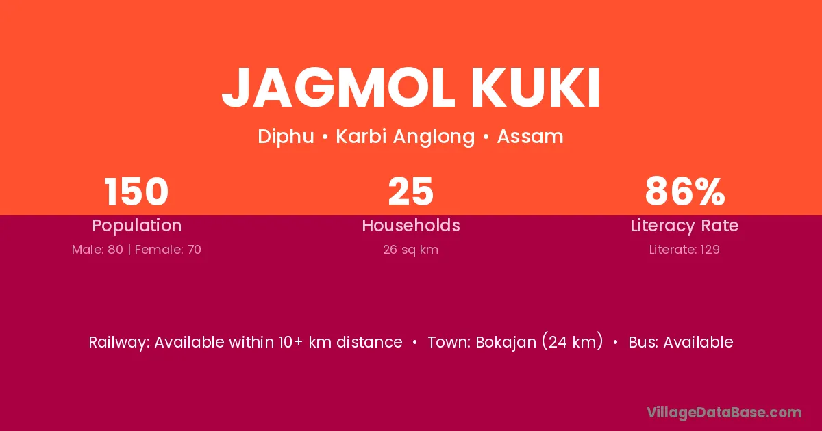 Bokajan (24 km) is the nearest town to Jagmol Kuki village for major economic activities and is located approximately 24 km away.