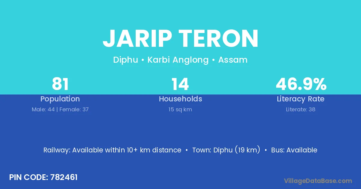 Diphu (19 km) is the nearest town to Jarip Teron village for major economic activities and is located approximately 19 km away.