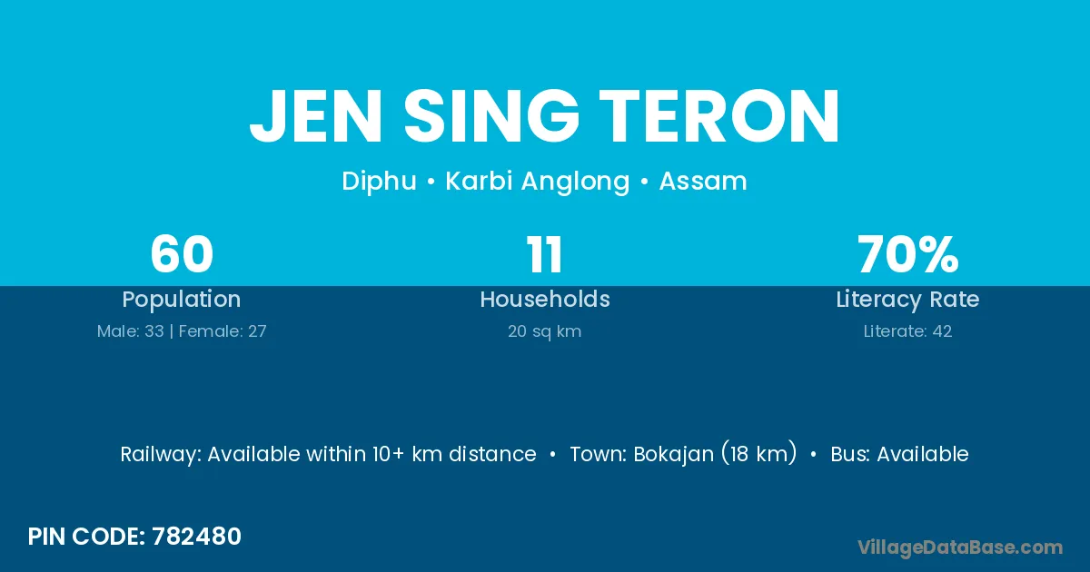 Bokajan (18 km) is the nearest town to Jen Sing Teron village for major economic activities and is located approximately 18 km away.