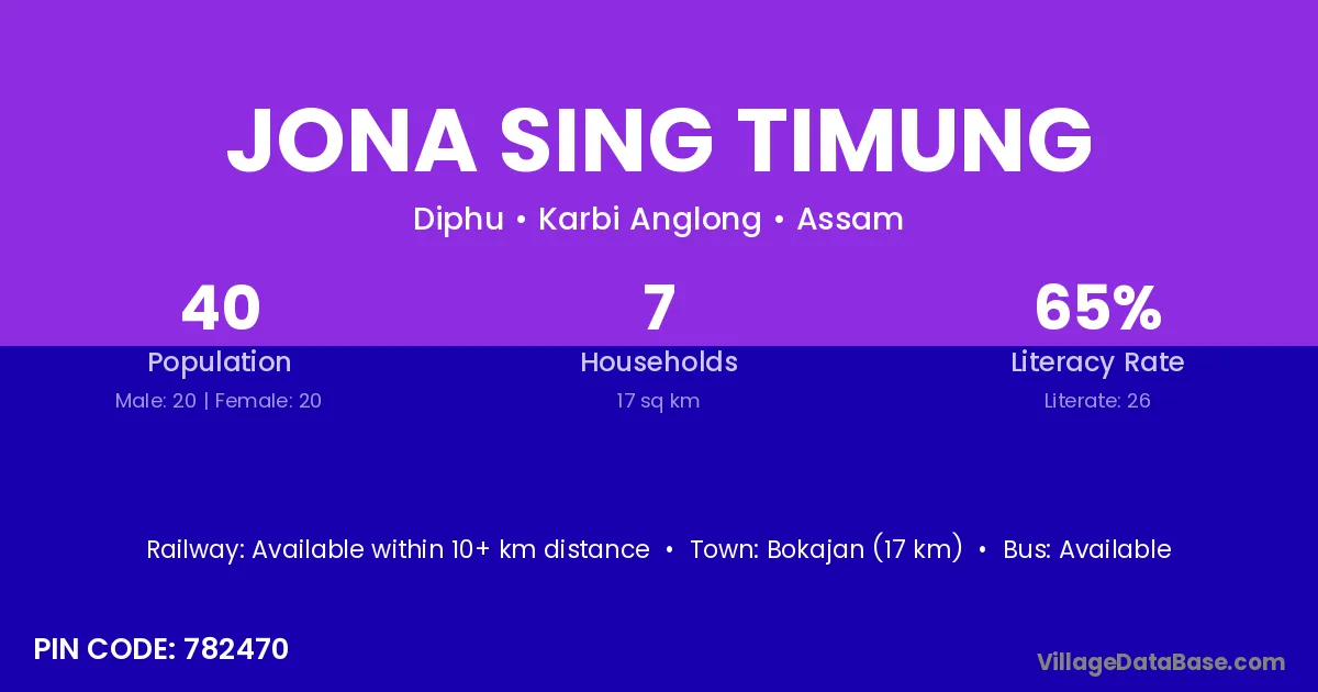 Bokajan (17 km) is the nearest town to Jona Sing Timung village for major economic activities and is located approximately 17 km away.