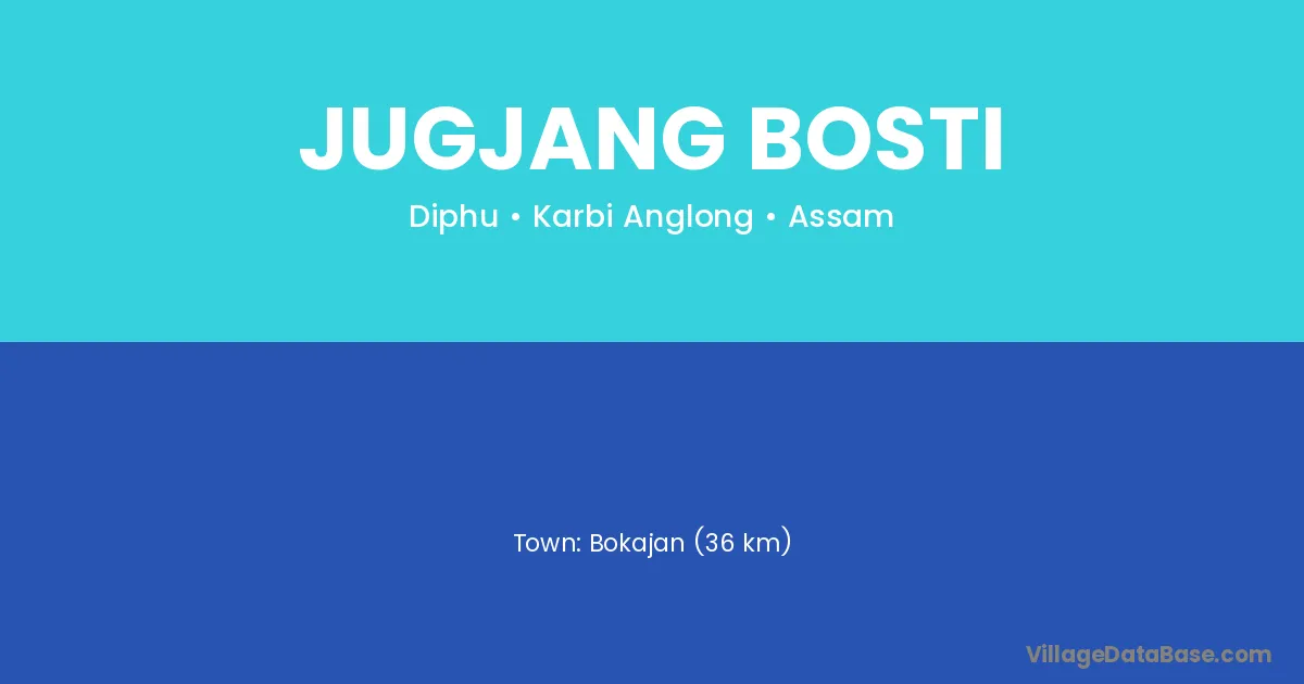 Bokajan (36 km) is the nearest town to Jugjang Bosti village for major economic activities and is located approximately 36 km away.