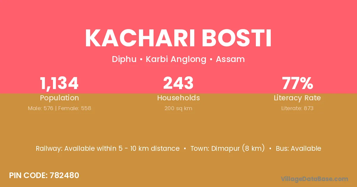 Dimapur (8 km) is the nearest town to Kachari Bosti village for major economic activities and is located approximately 8 km away.