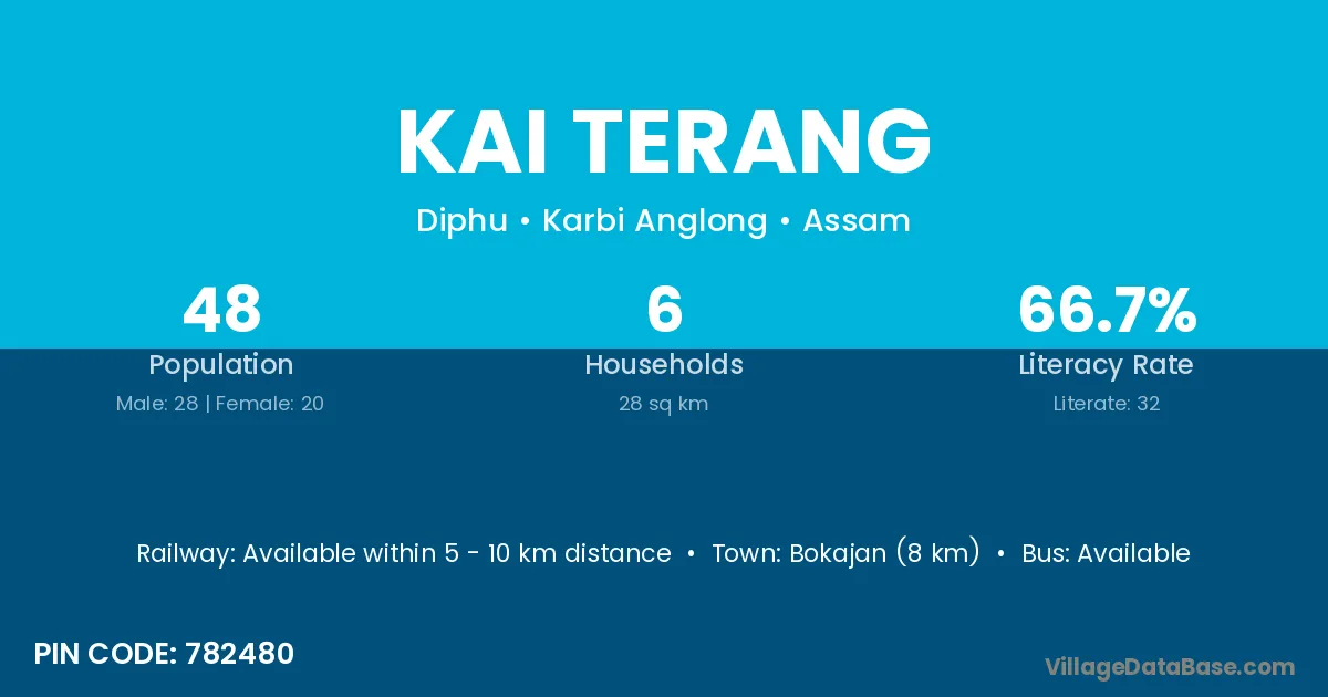 Bokajan (8 km) is the nearest town to Kai Terang village for major economic activities and is located approximately 8 km away.