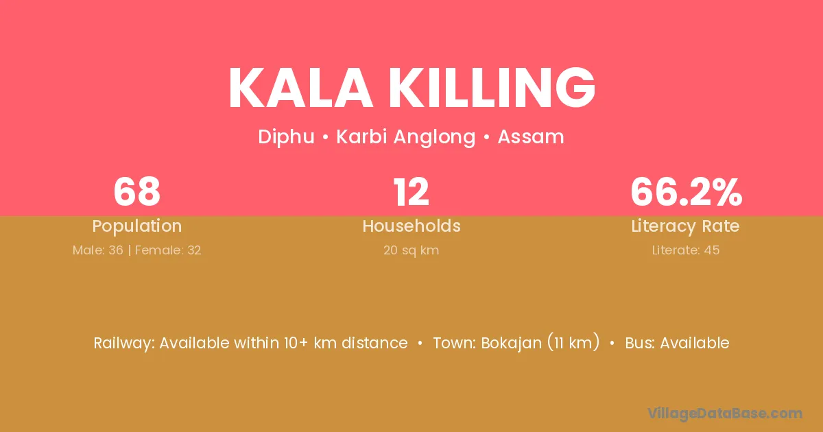 Bokajan (11 km) is the nearest town to Kala Killing village for major economic activities and is located approximately 11 km away.
