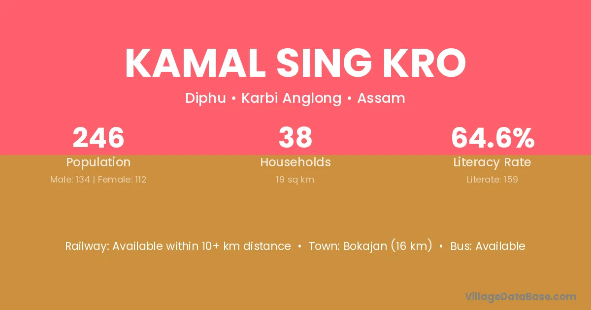Bokajan (16 km) is the nearest town to Kamal Sing Kro village for major economic activities and is located approximately 16 km away.