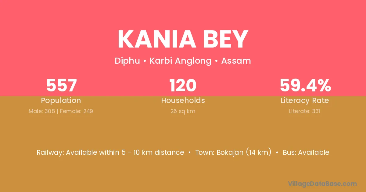 Bokajan (14 km) is the nearest town to Kania Bey village for major economic activities and is located approximately 14 km away.