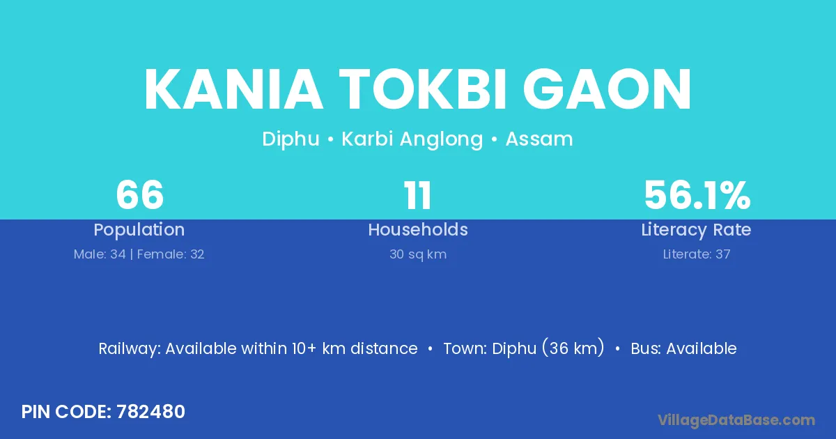 Diphu (36 km) is the nearest town to Kania Tokbi Gaon village for major economic activities and is located approximately 36 km away.