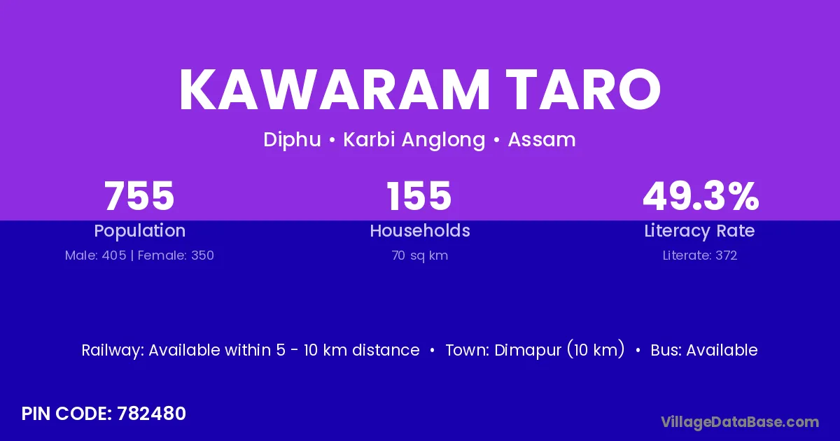 Dimapur (10 km) is the nearest town to Kawaram Taro village for major economic activities and is located approximately 10 km away.