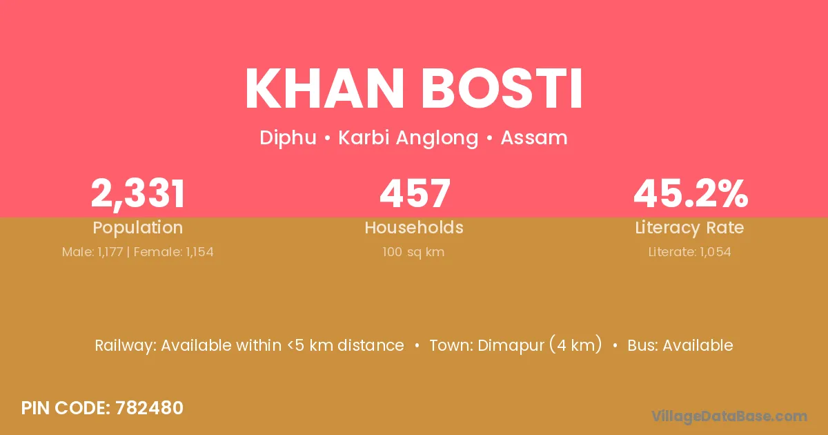 Dimapur (4 km) is the nearest town to Khan Bosti village for major economic activities and is located approximately 4 km away.