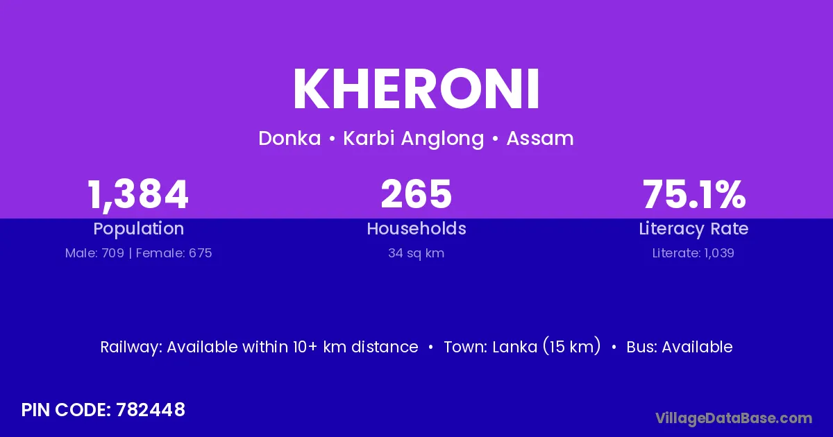 Diphu (13 km) is the nearest town to Kheroni village for major economic activities and is located approximately 13 km away.