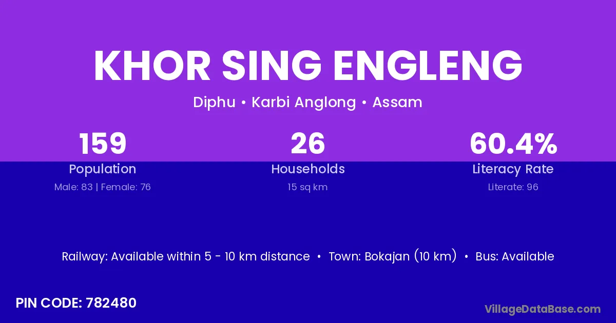 Bokajan (10 km) is the nearest town to Khor Sing Engleng village for major economic activities and is located approximately 10 km away.