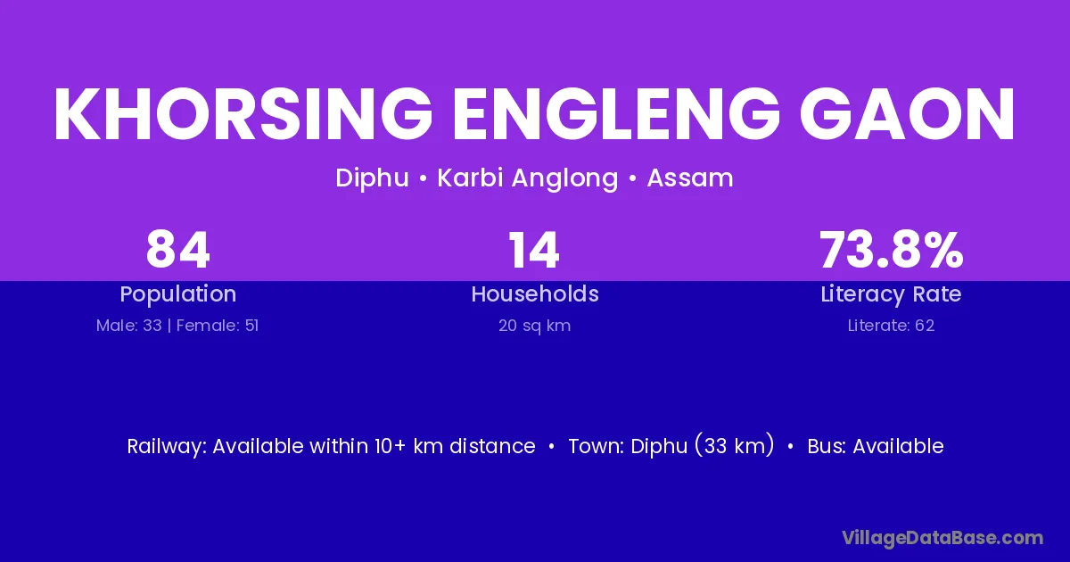 Khorsing Engleng Gaon village has a total population of 84 people, of which 33 are males and 51 are females.