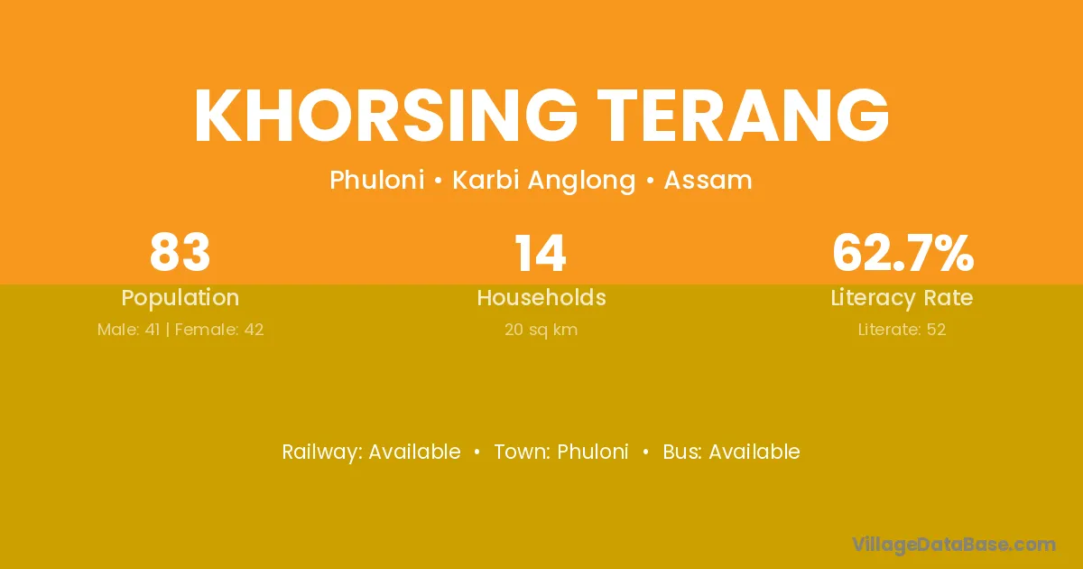 Diphu (14 km) is the nearest town to Khorsing Terang village for major economic activities and is located approximately 14 km away.