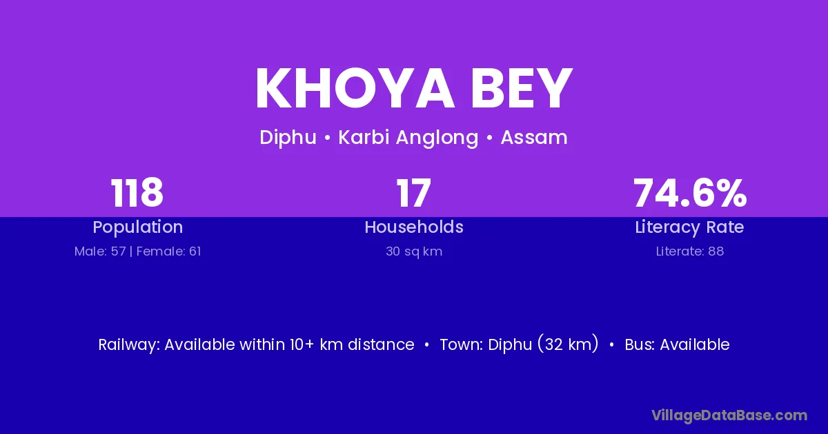 Diphu (32 km) is the nearest town to Khoya Bey village for major economic activities and is located approximately 32 km away.