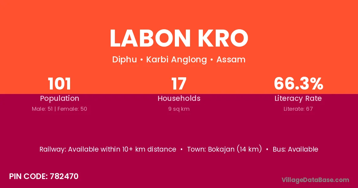 Bokajan (14 km) is the nearest town to Labon Kro village for major economic activities and is located approximately 14 km away.