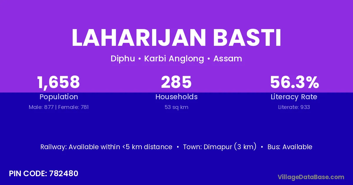 Dimapur (3 km) is the nearest town to Laharijan Basti village for major economic activities and is located approximately 3 km away.