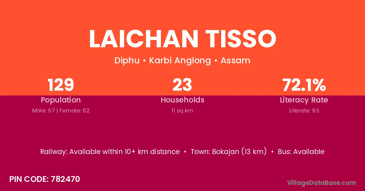 Bokajan (13 km) is the nearest town to Laichan Tisso village for major economic activities and is located approximately 13 km away.